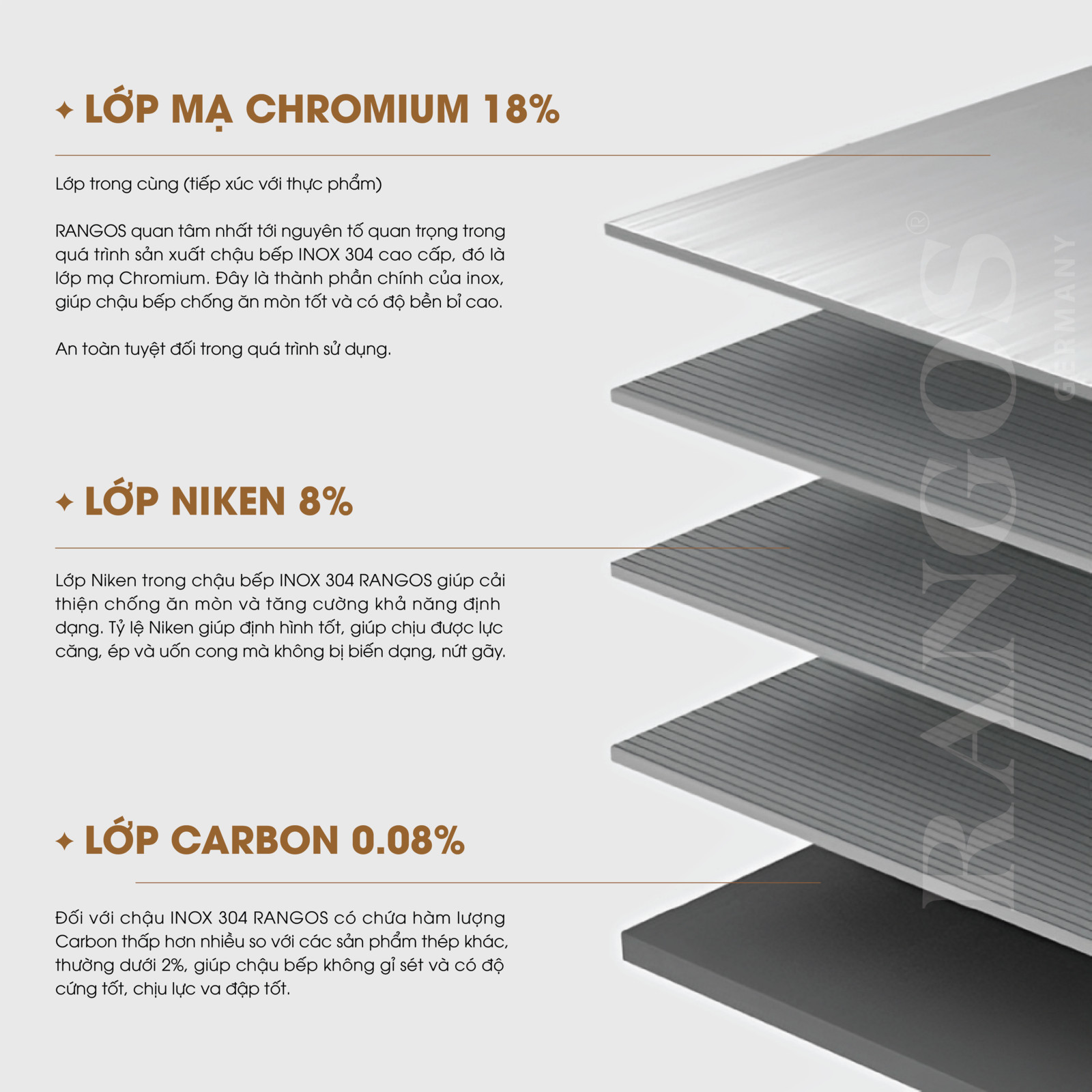 Lớp Carbon 0.08%: Hàm lượng Carbon tiêu chuẩn trong INOX phải dưới 2% để đảm bảo tính an toàn. Đối với chậu bếp Inox POSCO Hàn Quốc RANGOS có tỉ lệ Carbon chỉ chiếm 0.08% thấp hơn nhiều so với vật liệu INOX khác vừa đảm bảo an toàn vừa giúp chậu bếp không bị gỉ sét và có độ cứng tốt, chịu lực va đập tốt.