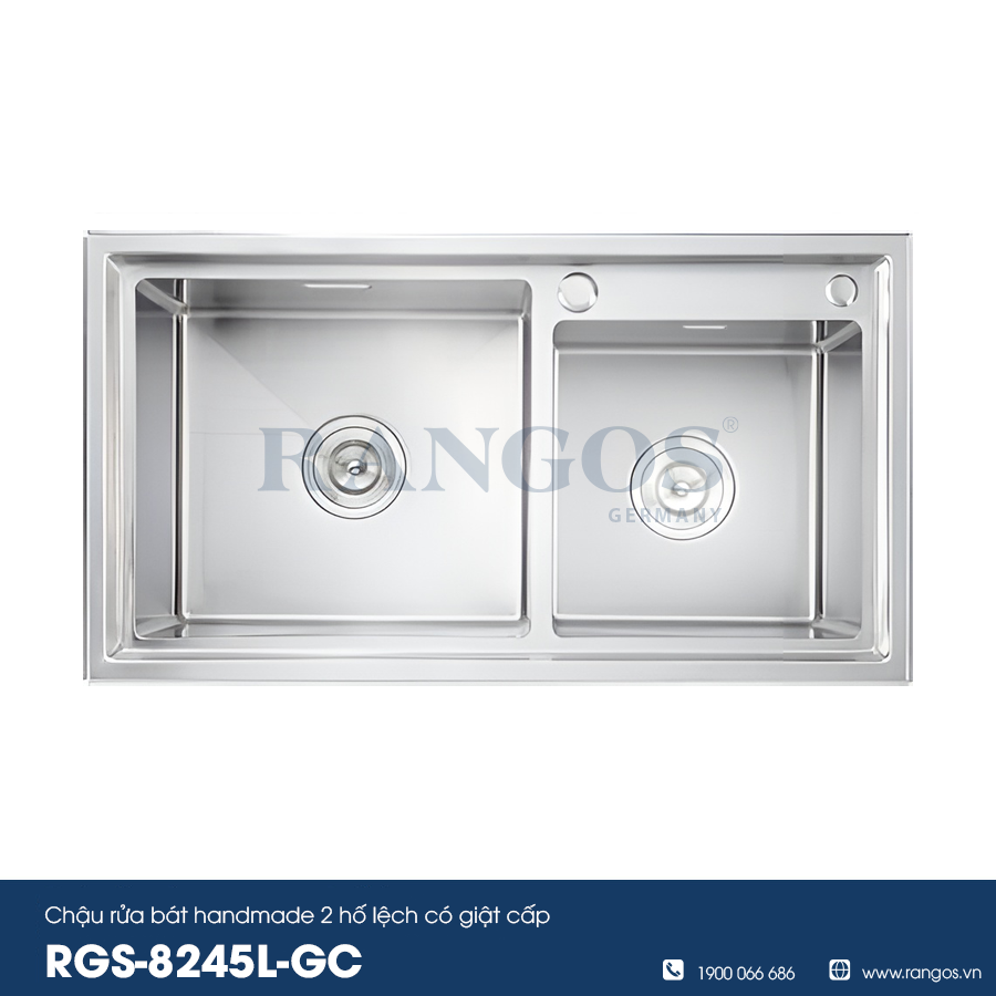 - Tên sản phẩm: Chậu rửa bát handmade 2 hố lệch có giật cấp RGS-8245L-GC