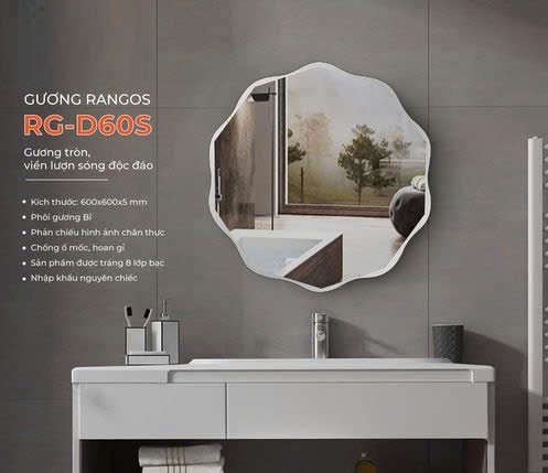 - Gương Rangos RG-D60S có hình tròn, có viền cách điệu lượn sóng, mềm mại như những dải lụa tung bay trước gió. Với sự cải tiến trong thiết kế này, chiếc gương RG-D60S sẽ mang lại sự độc đáo, ấn tượng trong không gian nhà tắm của bạn.