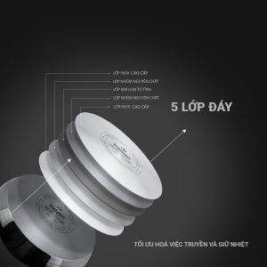 Trong đó lớp ngoài cùng là inox 430, các lớp giữa lần lượt là nhôm nguyên chất, thép từ tính cao, nhôm nguyên chất và lớp trong cùng là Inox 304 giúp nồi có thể sử dụng trên nhiều loại bếp khác nhau như bếp từ, bếp hồng ngoại, bếp gas…